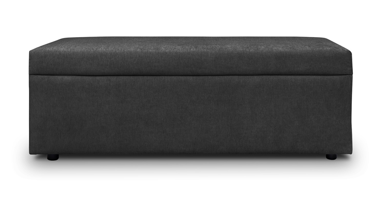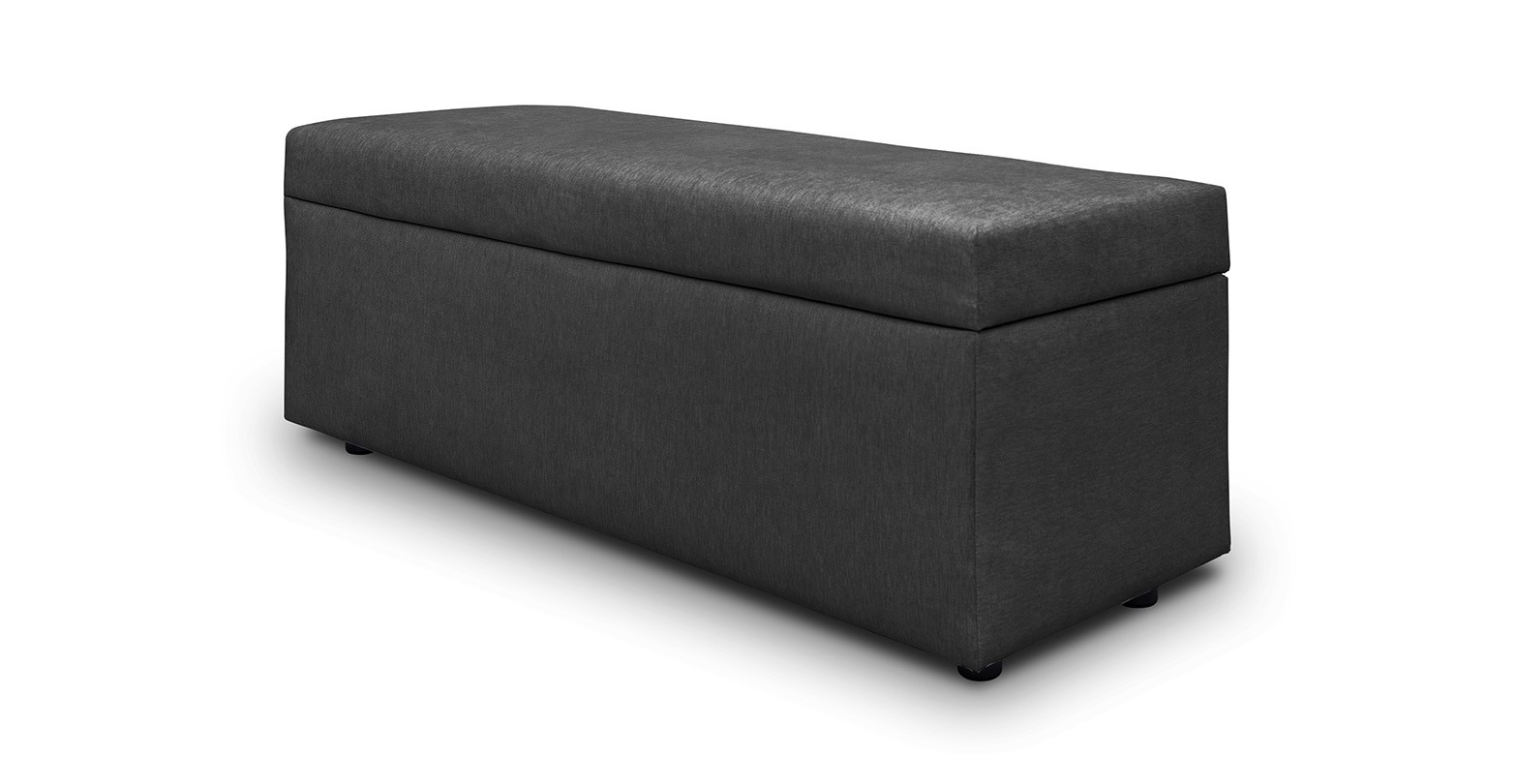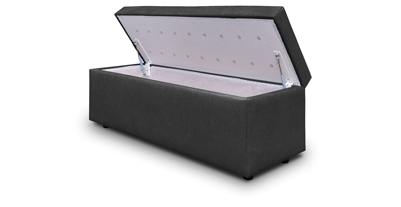 Bancheta tapitata, în stil modern, cu spatiu de depozitare si sezut confortabil.