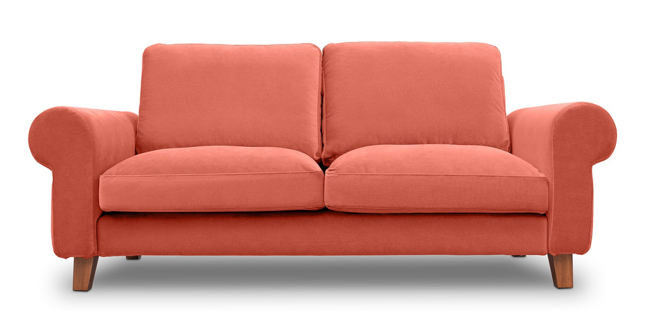 Canapea fixa de 2 locuri, cu brate rotunde si picioare de lemn, disponibila în mai multe variante de culori.