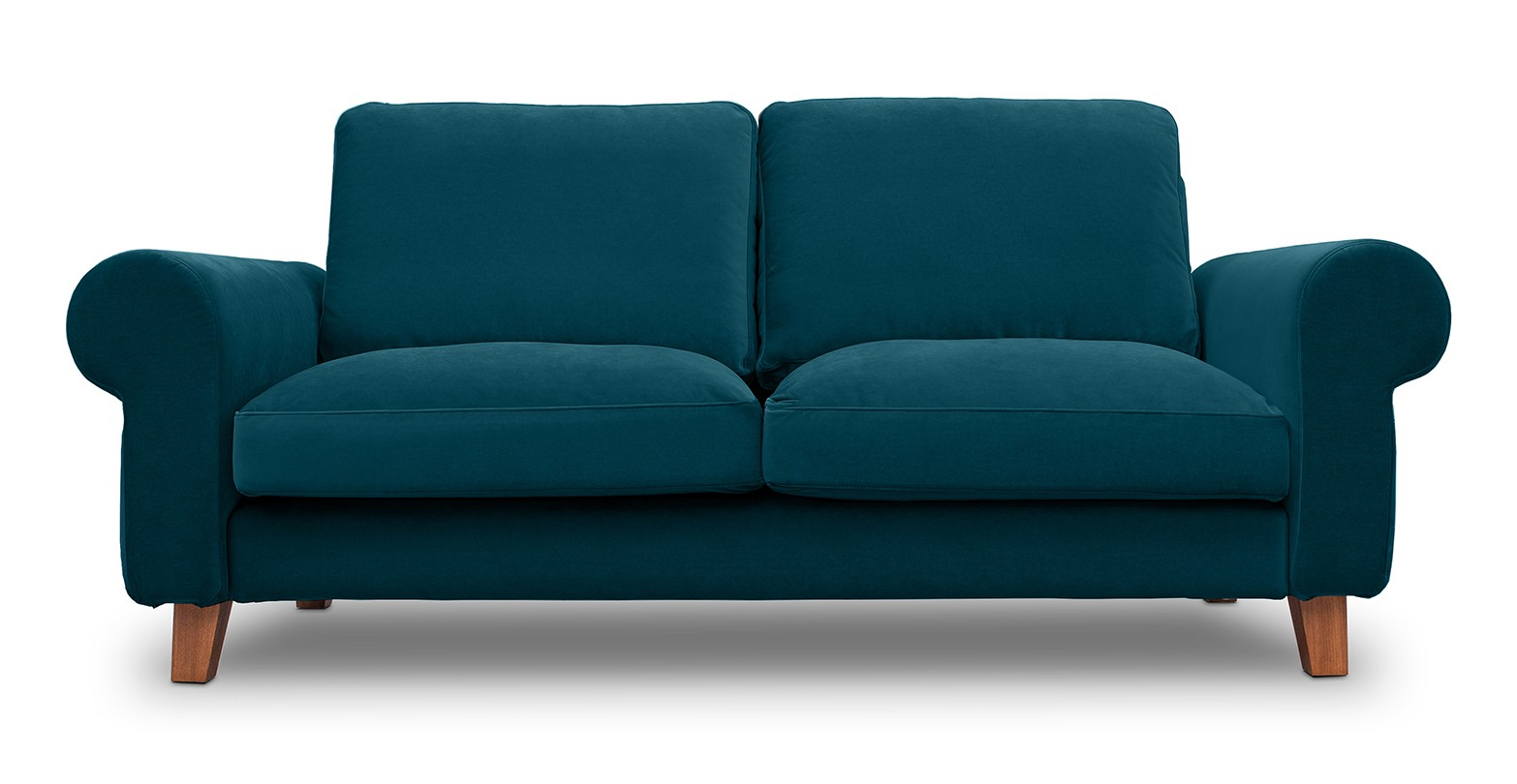 Canapea fixa de 2 locuri, cu brate rotunde si picioare de lemn, disponibila în mai multe variante de culori.
