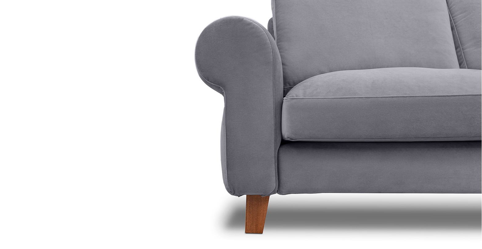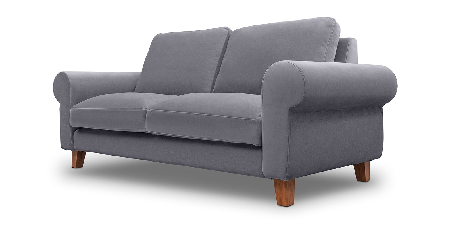 Canapea fixa de 2 locuri, cu brate rotunde si picioare de lemn, disponibila în mai multe variante de culori.