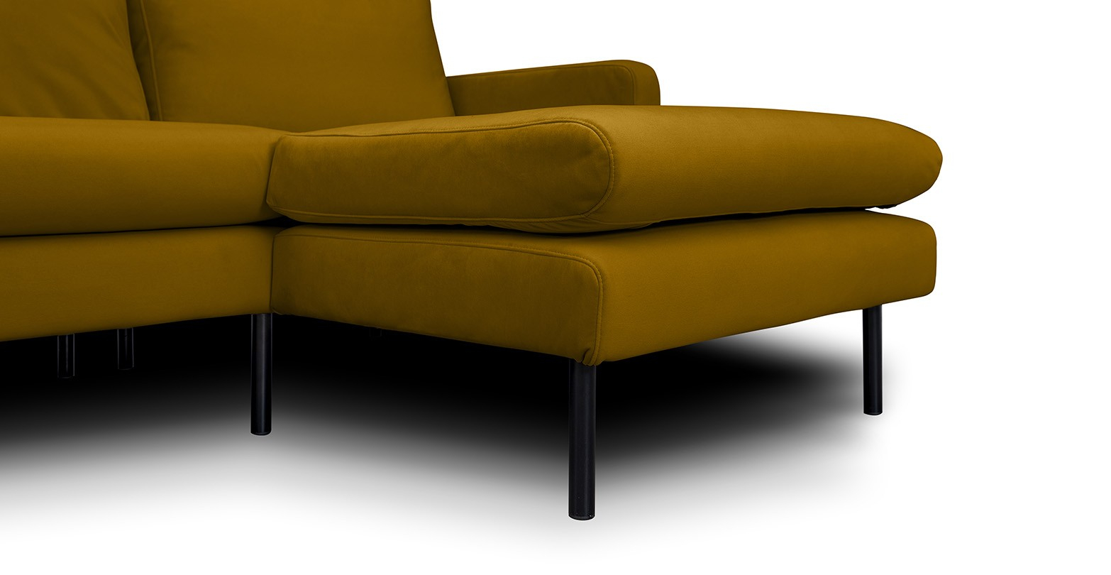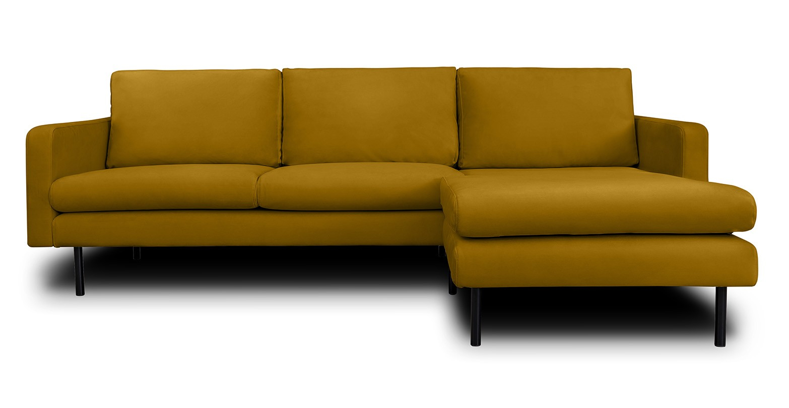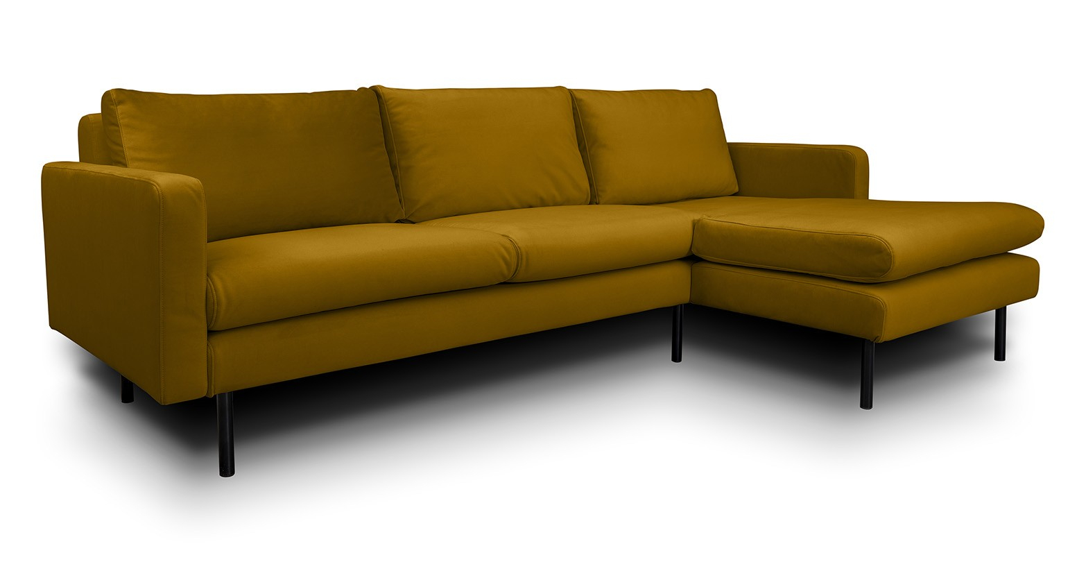 Canapea de trei locuri, cu sezlong, design simplu si picioare metalice.