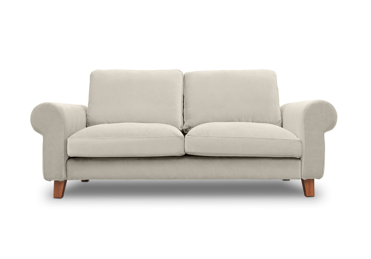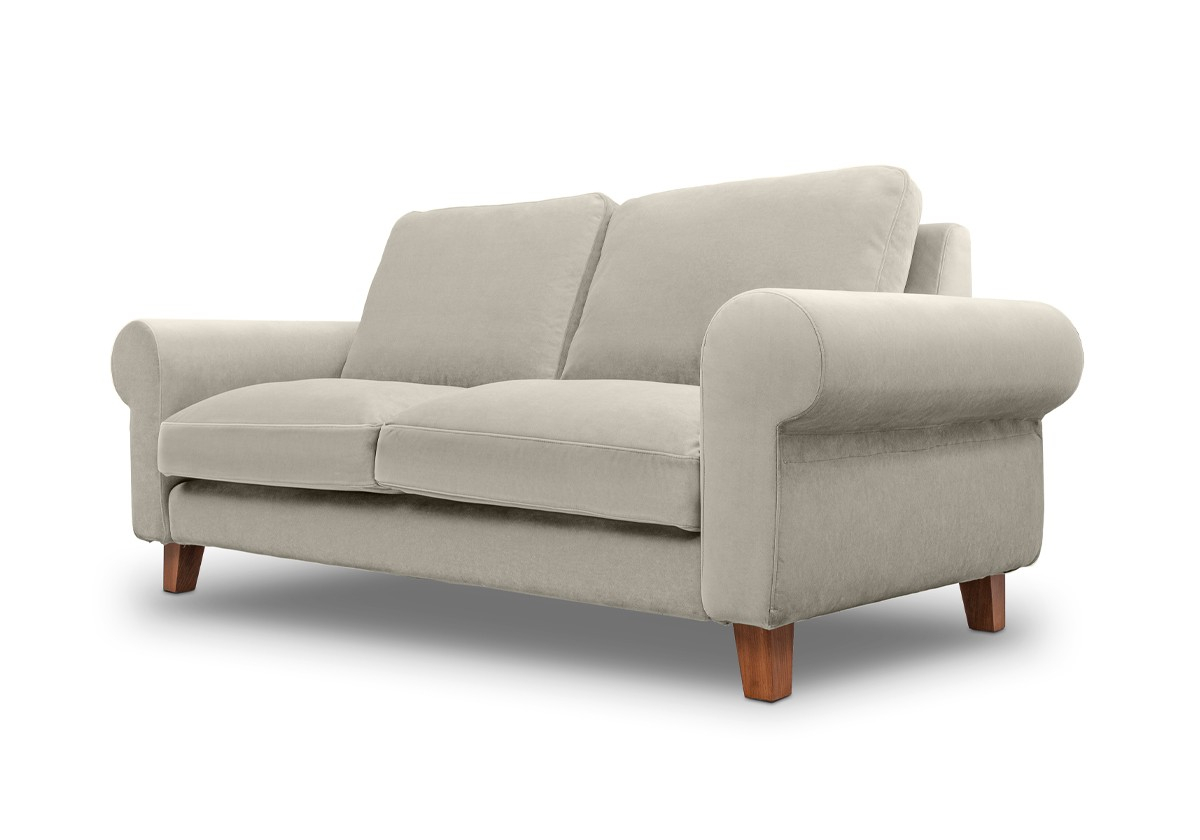 Canapea fixa de 2 locuri, cu brate rotunde si picioare de lemn, disponibila în mai multe variante de culori.