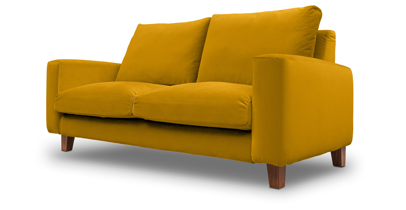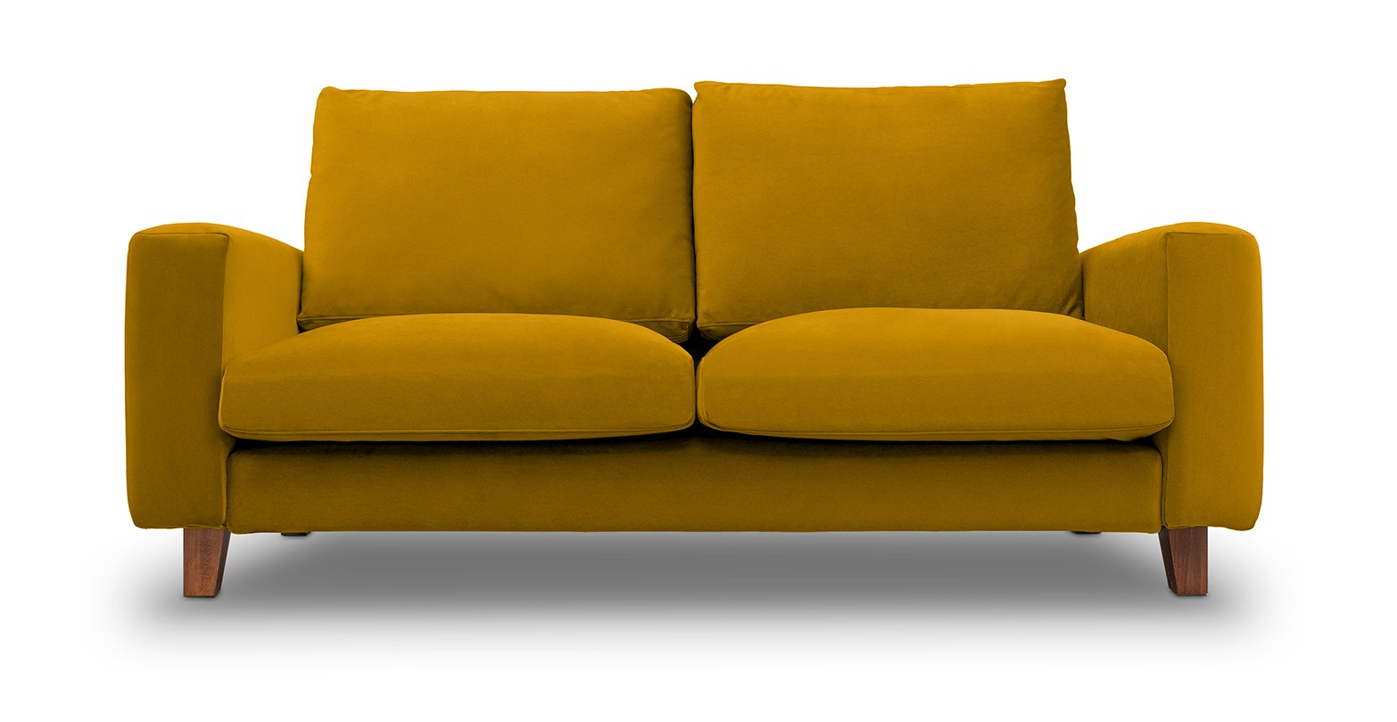 Canapea fixa de 2 locuri, cu brate drepte si picioare de lemn, disponibila în mai multe variante de culori.