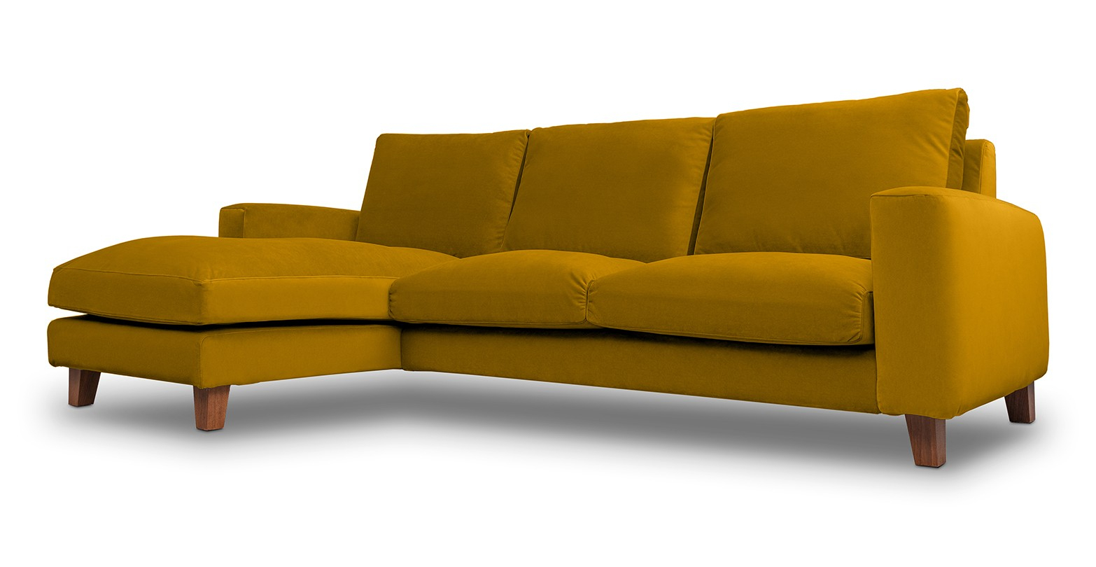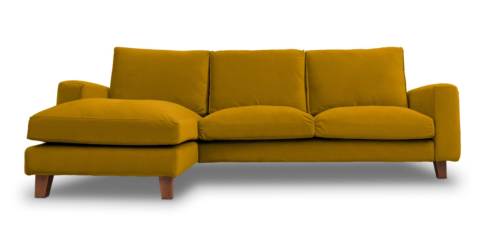 Canapea fixa de 3 locuri, cu brate drepte si sezlong, disponibila în mai multe variante de culori.