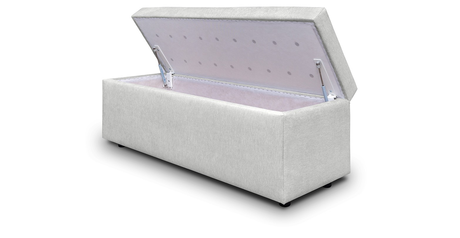 Bancheta tapitata, în stil modern, cu spatiu de depozitare si sezut confortabil.