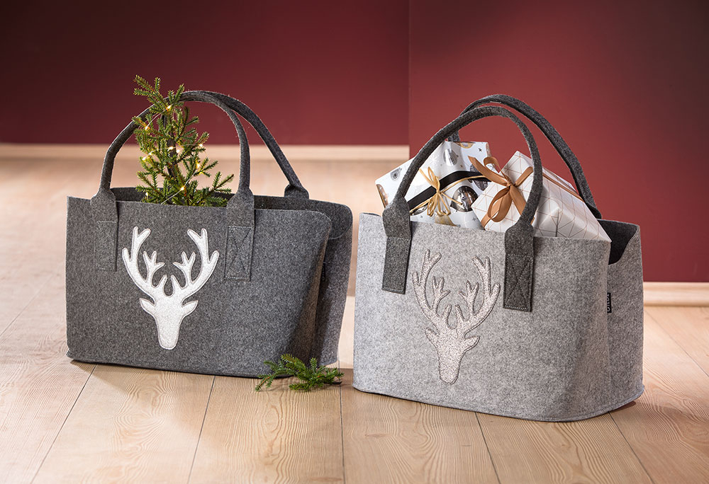 Geanta, „Hirsch”, motiv cu cerbi, fetru, gri deschis, gri inchis, PU 4, 2 asortate, L. 20 cm, l. 40 cm, H 26 cm