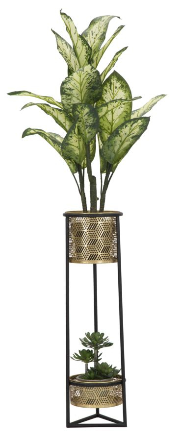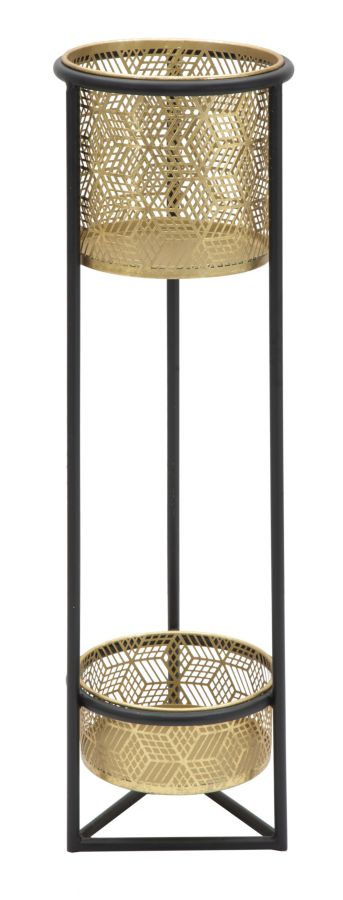 Suport pentru flori rotund, elegant, cu 2 niveluri, din metal auriu si baza metalica neagra. Suporturile pentru ghivece sunt detasabile. Liniile esentiale si sculpturile geometrice dau o nota de lumina si eleganta.