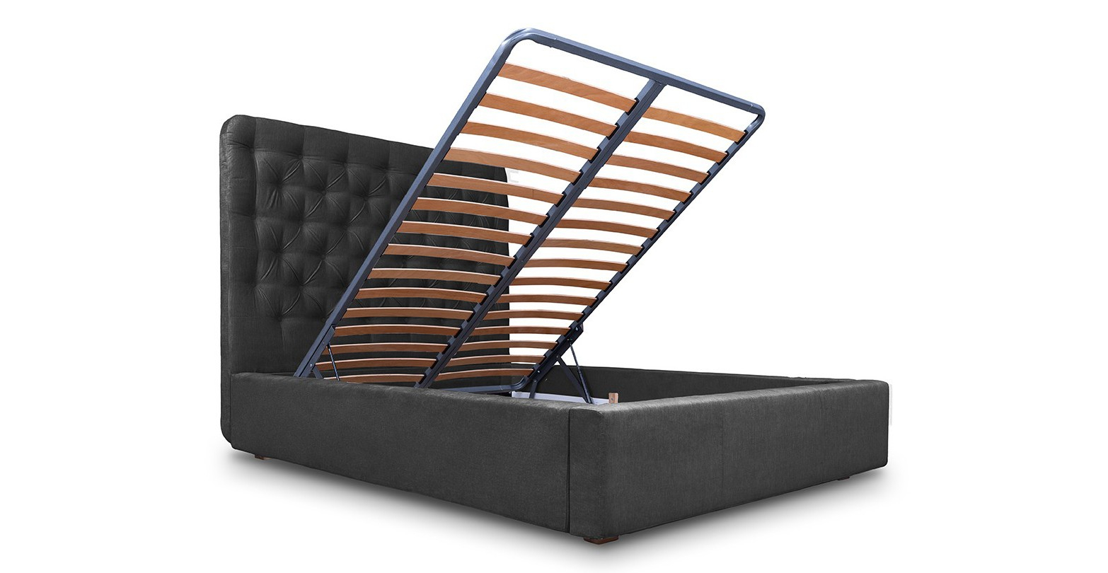 Pat tapitat, cu lada de depozitare si somiera rabatabila disponibil în mai multe dimensiuni si variante de culori.