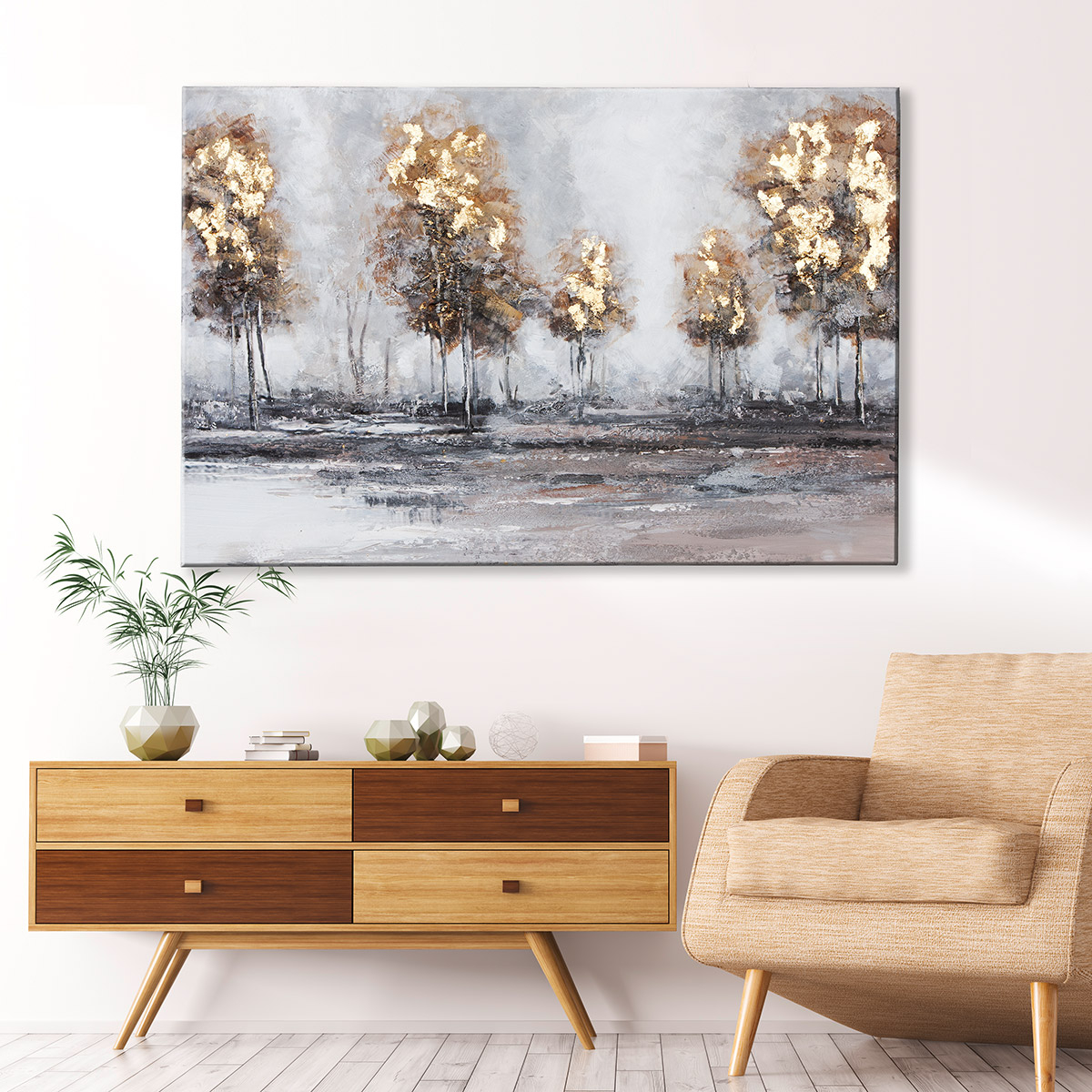 Tablou, dreptunghiular, „Waldlightung”, motiv padure, panza, gri, auriu, PU 1, L. 3,5 cm, l. 120 cm, H 80 cm