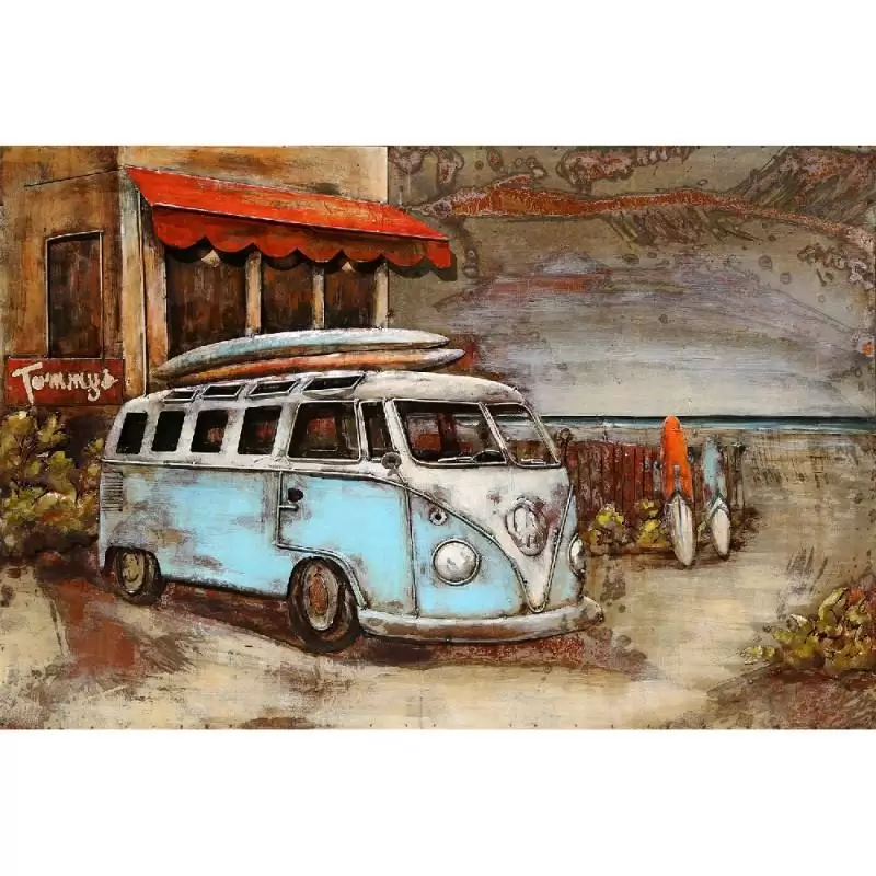 Blue bus este un tablou metalic 3D, o imagine in relief ilustrand un microbuz de culoare albastru.