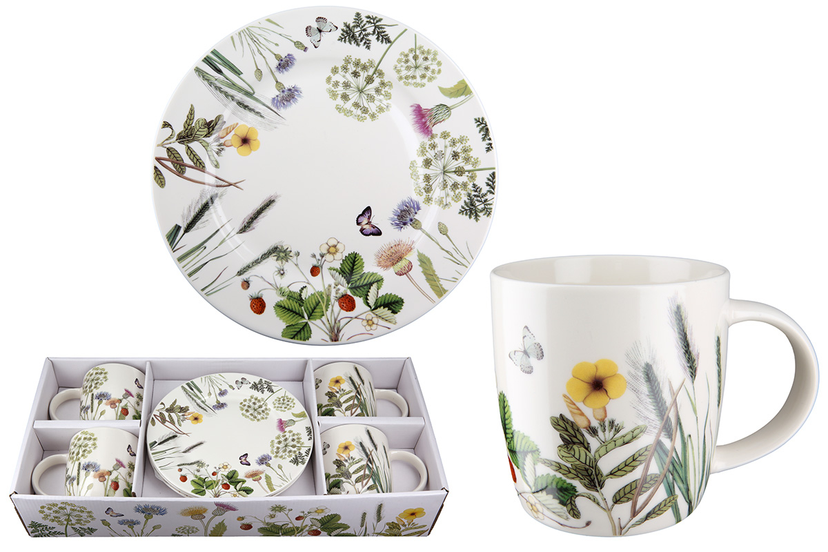 Serviciu de masa, "Wild Flowers", Design floral, Portelan, verde, alb, Setul consta din 4 cești și 4 farfurii | Ceașca: L 12.5 x H 9 x A 8.7 cm| Farfurie: D 19.2 x H 1.4 cm