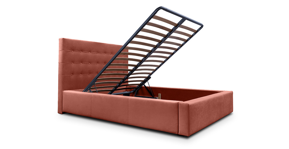 Pat tapitat, cu lada de depozitare si somiera rabatabila disponibil în mai multe dimensiuni si variante de culori.