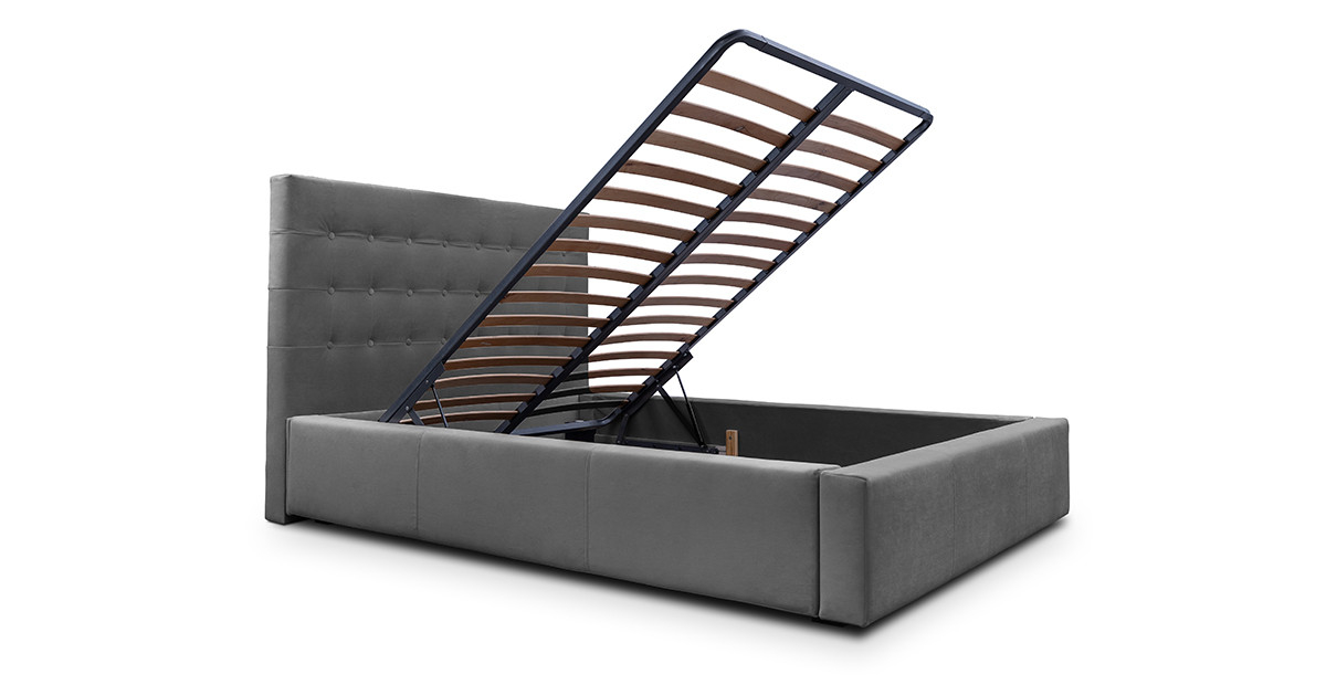 Pat tapitat, cu lada de depozitare si somiera rabatabila disponibil în mai multe dimensiuni si variante de culori.