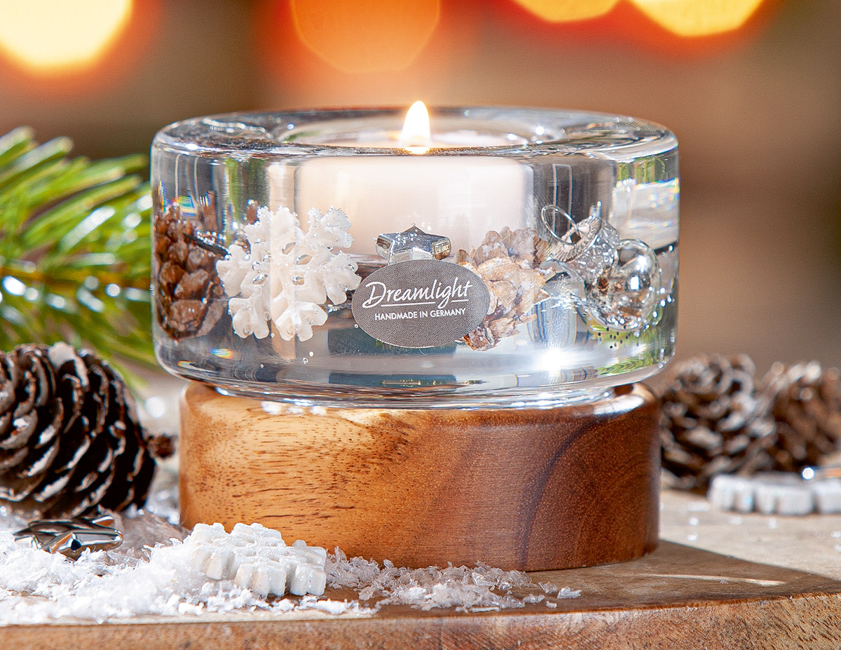 Dreamlight, Suport lumanare tip tealight, Colum Smart pe baza de lemn, „Poveste de iarna”, Lemn, maro, PU 4, H 6,5 cm, A. 8,5 cm