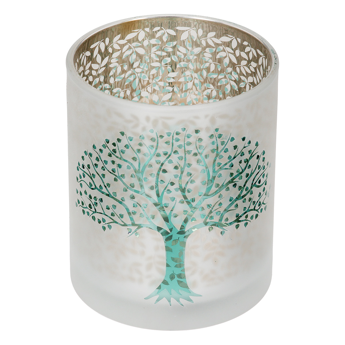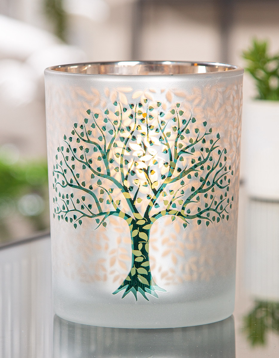 Suport lumanare, cilindric, Arborele vieții, Motiv copac, Sticlă, verde, alb, PU 8, H. 12,5 cm, D. 10 cm