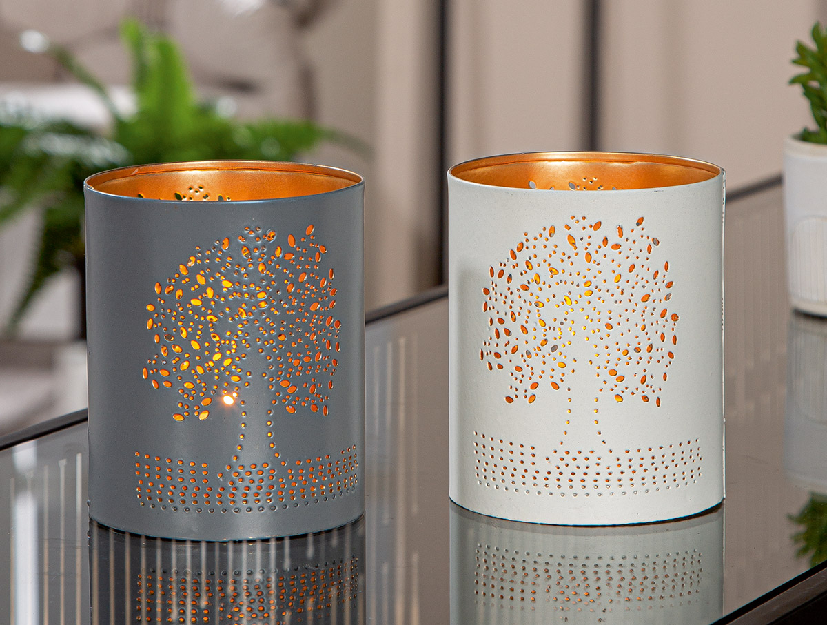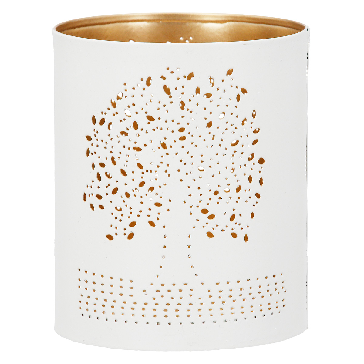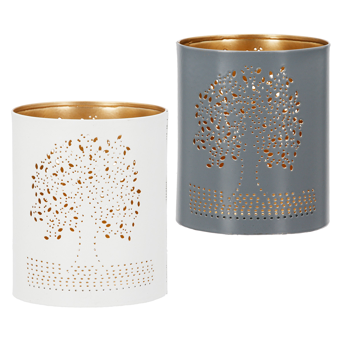 Suport lumanare, cilindric, Tree of Life, Motiv Arborele vieții, Metal, auriu, gri, alb, PU 12, 2 buc. asortate, H. 10 cm, D. 8,5 cm