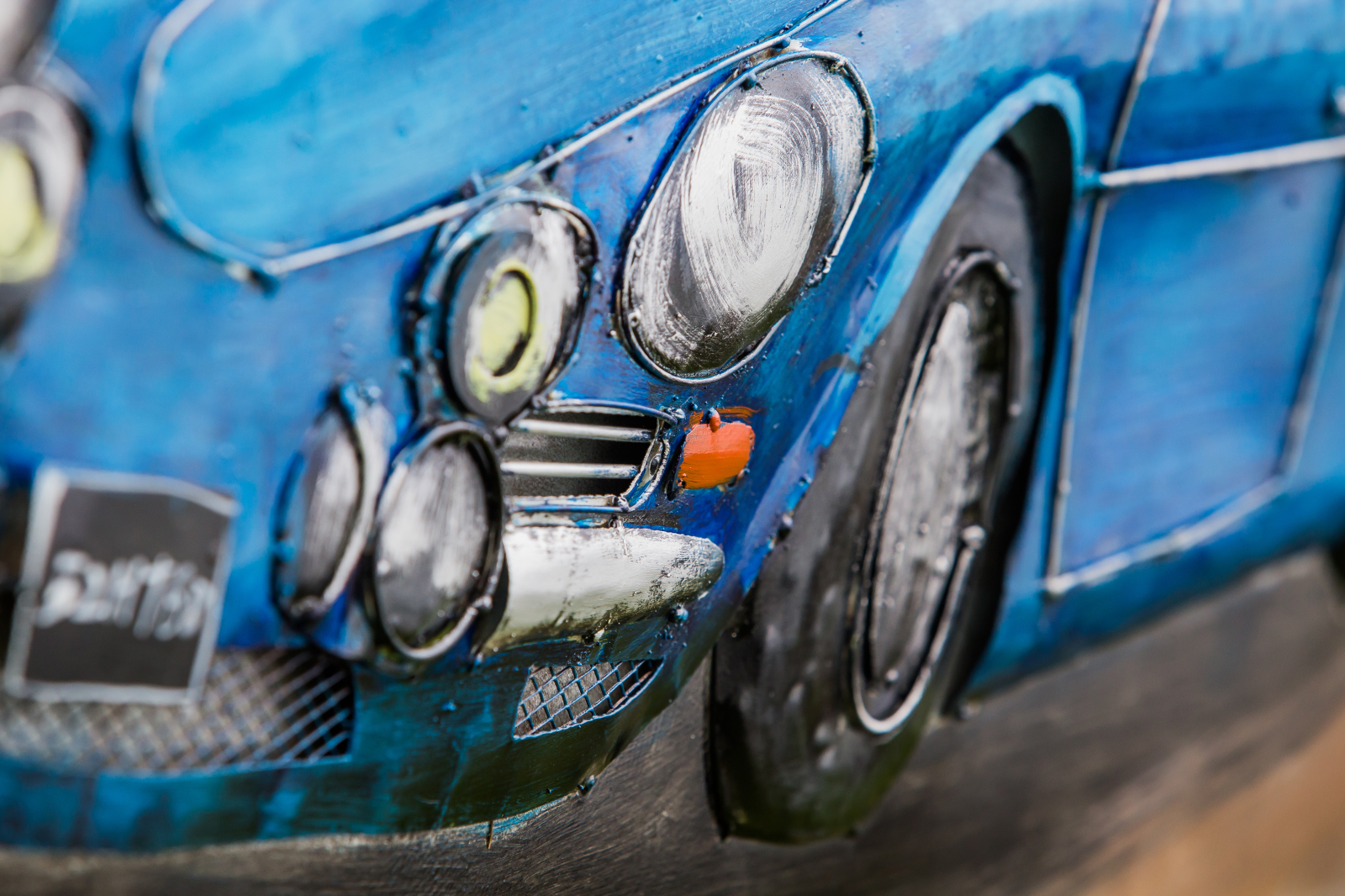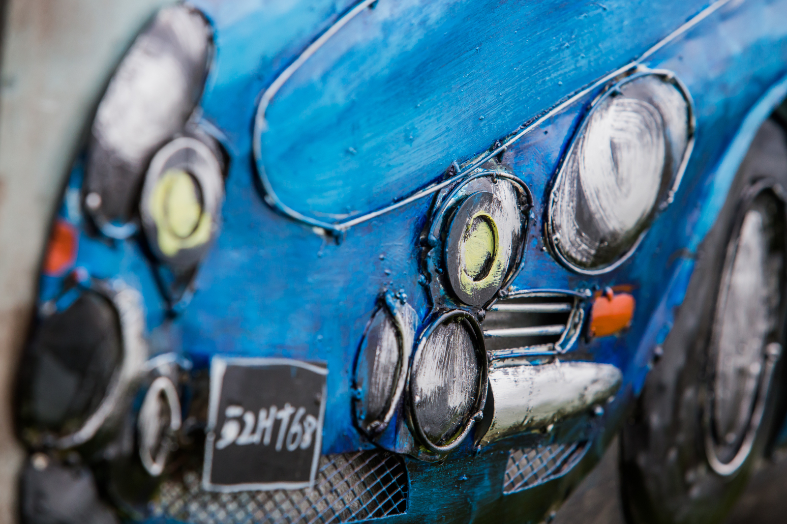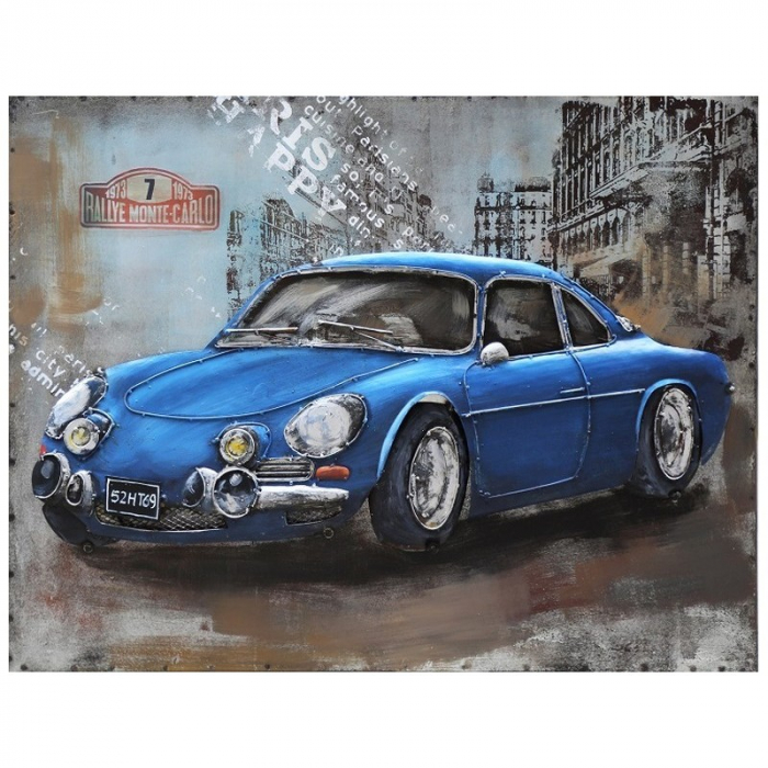 Blue sportcar este un tablou metalic 3D, o imagine in relief ilustrand o veche masina sport.