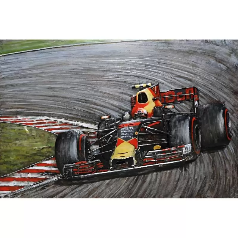 F1 este un tablou metalic 3D, o imagine in relief ilustrand o masina de Formula 1.