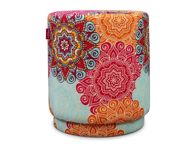 Taburet tapițat, cu design elegant și bază tip soclu, de talie mică.