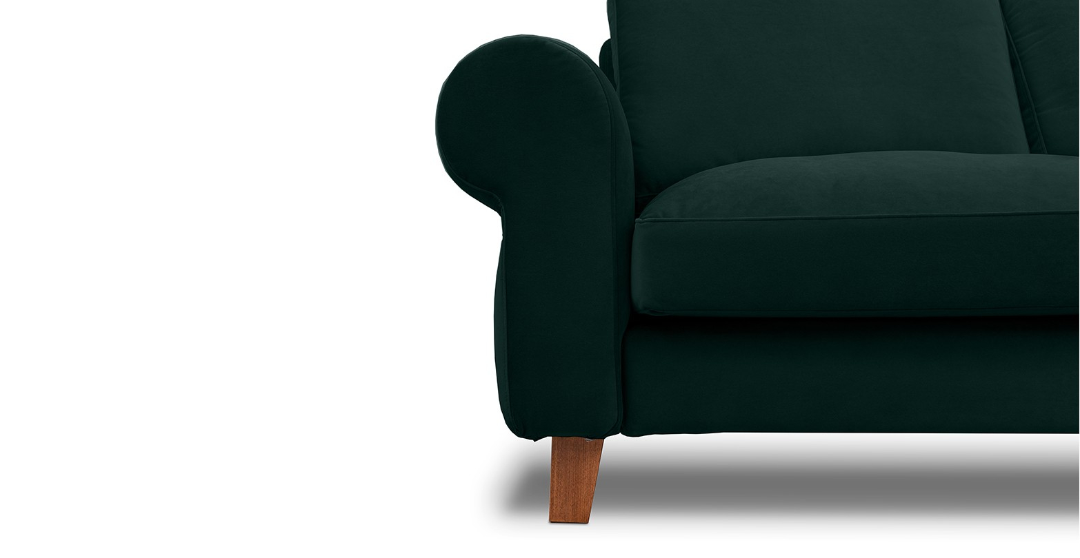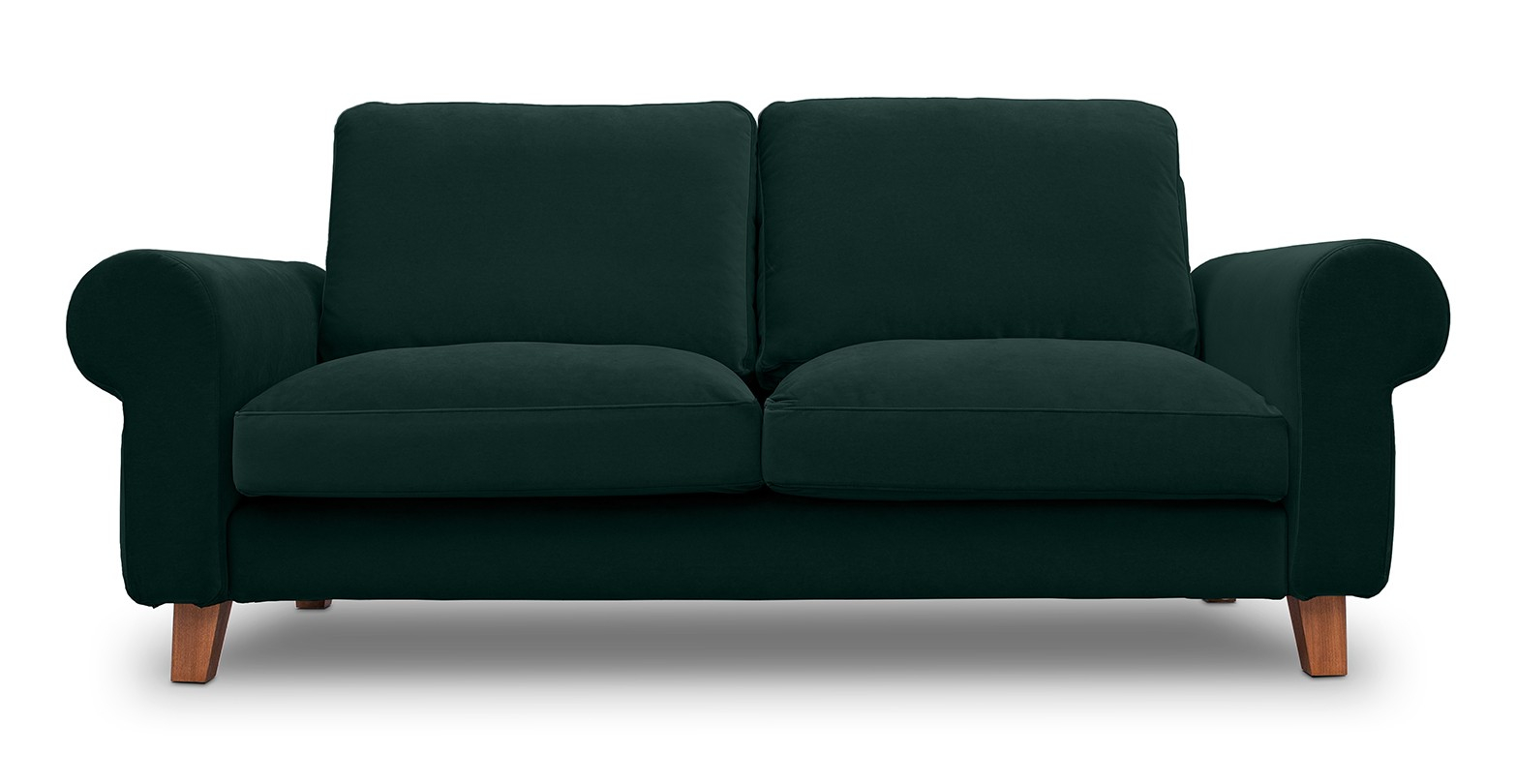 Canapea fixa de 2 locuri, cu brate rotunde si picioare de lemn, disponibila în mai multe variante de culori.
