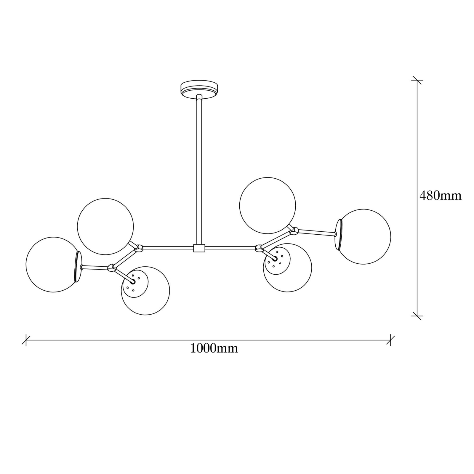 Baza: METAL Abajur: STICLA. Dimensiune: 100 x 58 cm Înălțime: 48 cm Diametru Abajur: 15 cm Înălțime Abajur: 15 cm Tip dulie: 6 x E 27 Max 40 W Diametrul plăci de bază: 10 cm Înălțimea plăcii de bază: 3 cm Include instrucțiuni de instalare și Codul IP:IP20, Becul nu este inclus.