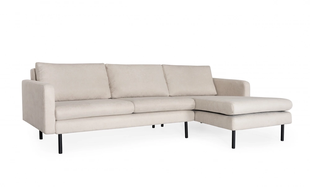 Canapea de trei locuri, cu șezlong, design simplu și picioare metalice.